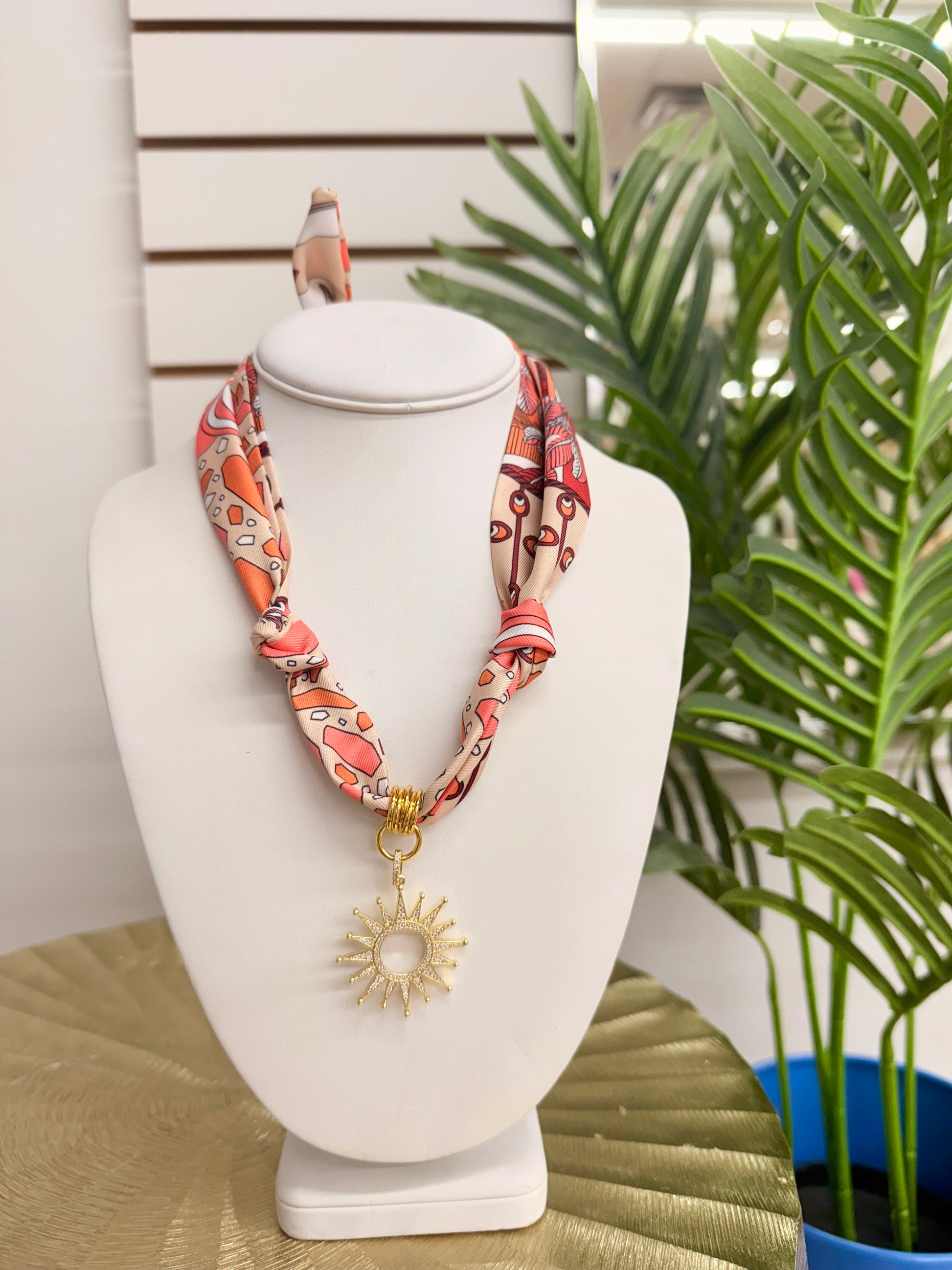 These necklaces are so fun! Each one is a beautiful fabric print adorned with a statement charm. Each necklace is a random array of scarfs in multiple prints with an assorted charm.
